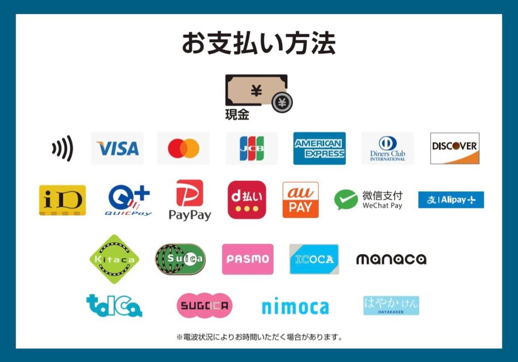 現金、クレジット、電子決済(交通系IC、WAON、nanaco)